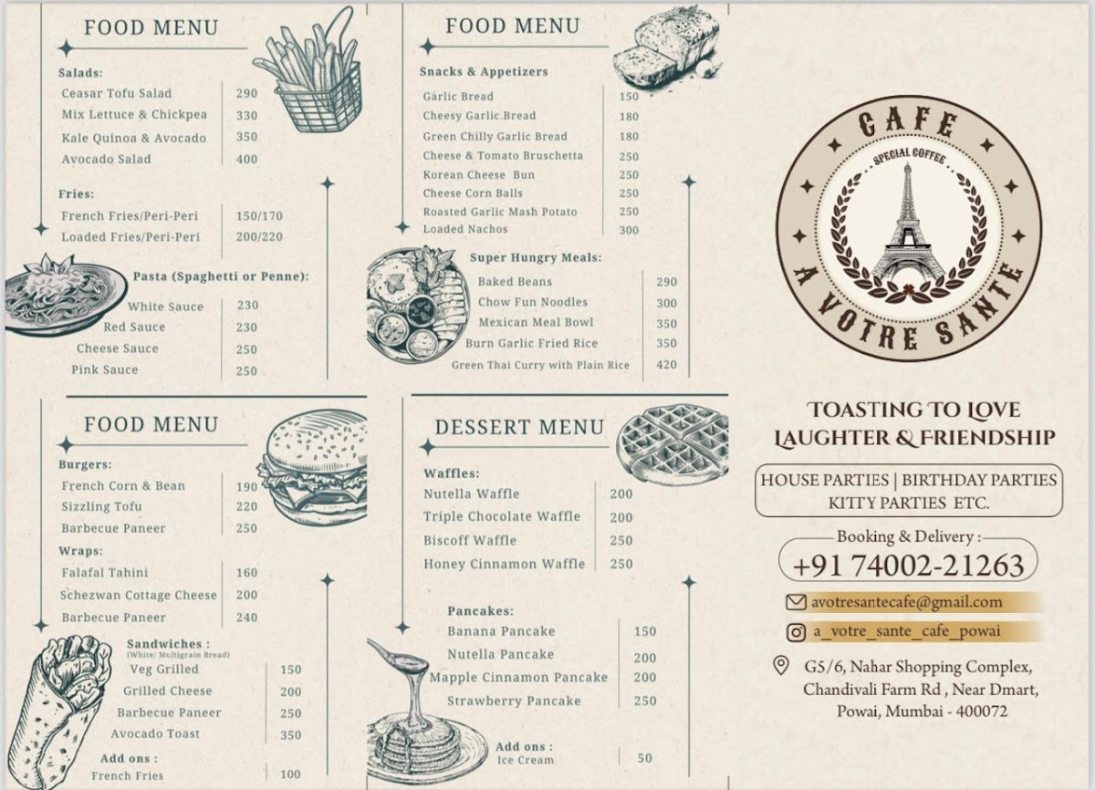 Step into the enchanting world of A Votre Santé Cafe, nestled in the bustling Nahar Shopping Complex, Chandivali, Powai, Mumbai. This cozy cafe beautifully embodies a European charm, providing a delightful escape for anyone looking to unwind with good food and warm ambiance.